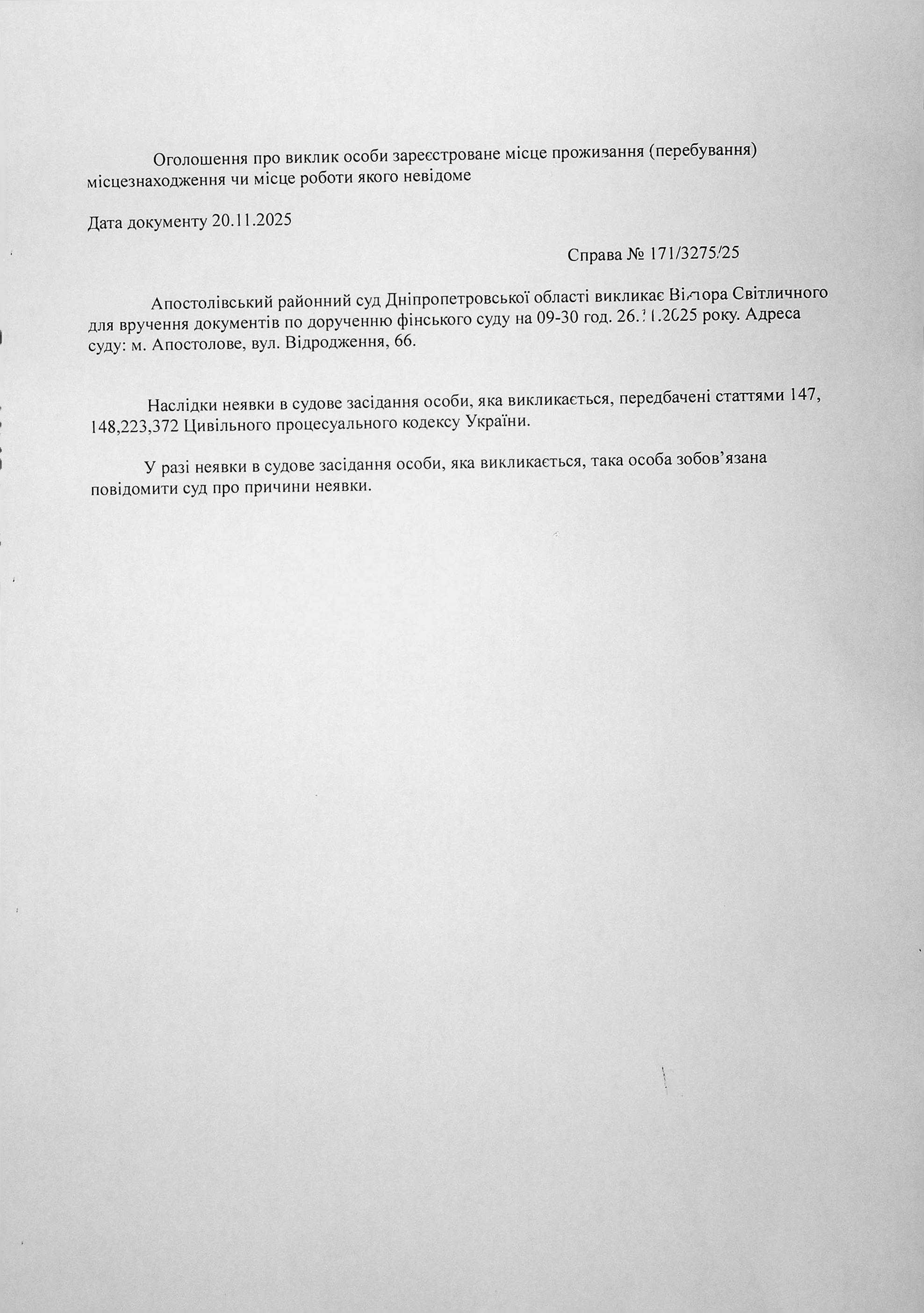 Оголошення про виклик Світличного Віктора